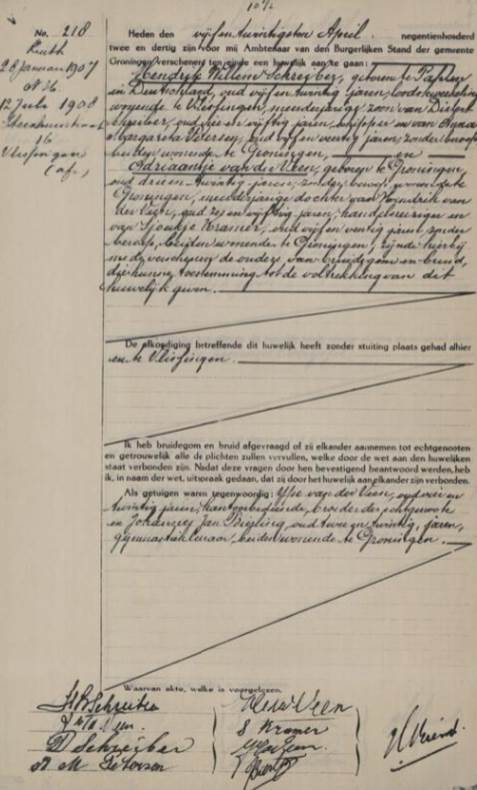 In de lange lintbebouwing langs de kanalen die het verveningsgebied doorsneden, scharrelden de eerste Schreiber’s de kost bij elkaar. Hun ‘thuishaven’ was Ommelanderwijk, net ten zuidoosten van Veendam waarmee het met een lang kanaal was verbonden. Uit de trouwaktes krijgen we een beeld van hun beroep. Friede Schreiber was arbeider evenals zijn zoon Hindrik terwijl diens echtgenote Aaltje Bakker dienstmeid was. Hun zoon Willem was alweer fabrieksarbeider en zijn vrouw Metta dienstmeid; bij hun huwelijk werd bij beide ouderparen vermeld werkman/-vrouw. Rintje Ottenhoff, die trouwde met Anna Janke Schreiber, de dochter van Hindrik en Aaltje, was boerenarbeider, zijn ouders weer werkman/-vrouw. Het zal geen vetpot zijn geweest ten huize van de familie Schreiber, Oost-Groningen had ook toen al een traditie van grote afstand tussen kapitaal en arbeid.