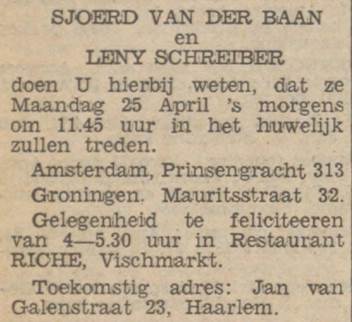 Sjoerd van der Baan overleed op 23 april 1997. Lenie van der Baan-Schreiber overleed op 8 juli 1997.