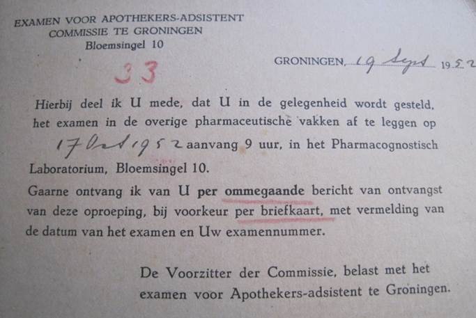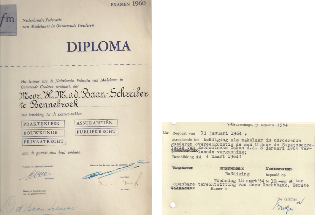 Diploma en beëdiging als makelaar; respectievelijk 1960 en maart 1964.