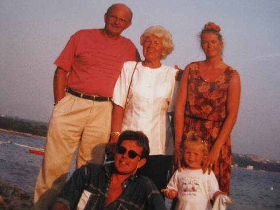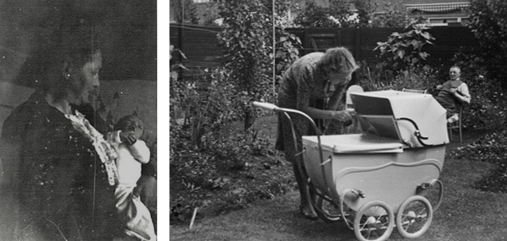 Anneke Post op de arm van oma Anna Janka en in 2005 met man en eigen kleinkinderen in de tuin te Spijkerboor.