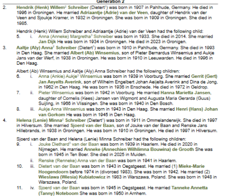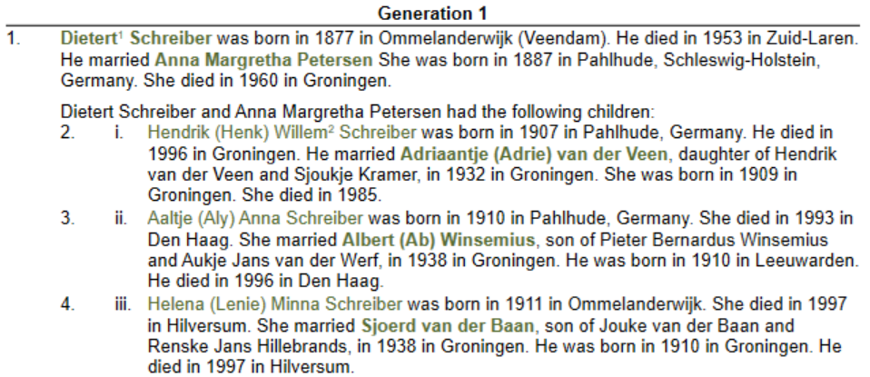 Veel weten we niet en er ligt een mooie uitdaging voor volgende generaties om de familiekroniek van Dietert Schreiber en Anna Petersen tot nog meer leven te leiden. Het waren onze grootouders en – wat je ook kan zeggen –  ze deden hun naam geen eer aan: het waren geen schrijvers en ook geen geweldige vertellers. Van hun voorgeschiedenis kennen we namen en data maar meestal weten we niet eens hoe ze de kost verdienden. Onze tekst is daarom ongebalanceerd: op gebieden waar we door toeval of speciale belangstelling meer weten, schrijven we meer. Neef Jouke heeft zich bijvoorbeeld serieus ingewerkt in de scheepvaarttraditie van de familie, zijn broer Dietert beoefent de genealogie. Er zijn ook andere bronnen die soms meer vragen opwerpen dan antwoorden, de fotoalbums – vrijwel geheel zonder bijgekrabbelde aantekeningen – vormen daarvan een voorbeeld. Aan de andere kant biedt de Delpher website weer een onverwacht compleet inzicht in de sportcarrière van met name dochter Lenie. De familiefilms uit de jaren vijftig blijken ook een prachtige bron van beeldmateriaal, dat het huiselijk leven van die tijd dichtbij brengen.