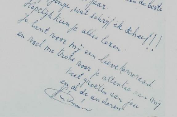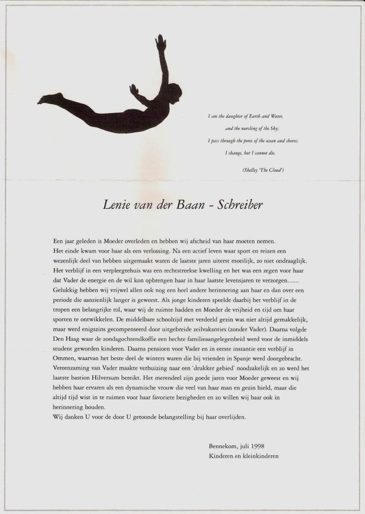 Een jaar na haar overlijden stuurden haar kinderen en kleinkinderen een prachtige kaart. Lenie zweeft daar, zoals we haar uit de jaren dertig kennen, hoog boven ons. Sjoerd zei het namens de anderen: “Ik heb zeer veel respect voor mijn beide ouders, om wie ze waren, maar ook om de liefde die ze voor elkaar en hun kinderen hadden.”