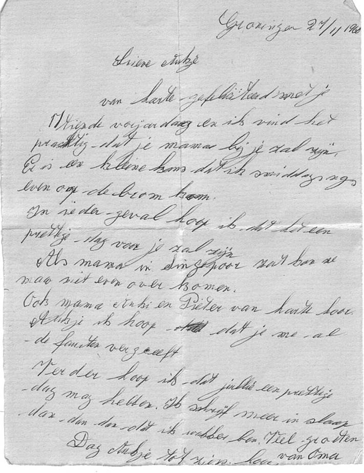 Hoewel de familiebanden in de loop der tijd vervaagden, bleef het contact ook in latere jaren voortbestaan. In de zomer van 1951 hebben Ankie en haar zus Aukje – op dat moment respectievelijk 8 jaar oud – een vakantie doorgebracht bij Annie en Jan. De brief die Ankie op 1 augustus naar ‘huis’ schreef, tekent fraai de cultuurschok van twee stadsmeisjes op het Oost-Groningse platteland. Het was hun eerste kennismaking met bedsteden en poepdozen, maar ook met het rijden met paard en wagen in een omgeving waar iedereen elkaar groette. Ze ontmoetten ook hun tot dan onbekende ooms en tantes en geven een karakterisering van hun huisgenoten. Ankie leest veel, maar Aukje gaat op avontuur. Maar ze delen één enkele, hilarische conclusie: de boerderij valt lelijk tegen en ze zullen blij zijn om weer thuis te zijn. Hoe het tegenbezoek van Hendrik en Gerarda (Grada in Ankie’s brief) naar Scheveningen – met uitstapjes naar Madurodam en dergelijke – is bevallen, weten we niet.