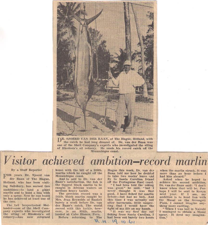 Bericht over recordvisvangst in de Rhodesia Herald; 19 oktober 1961.