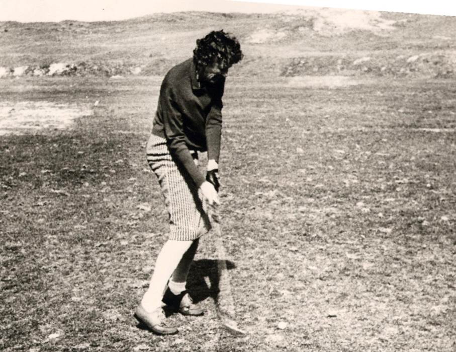 Lenie aan het golfen in een duinachtig landschap, vermoedelijk na 1958.