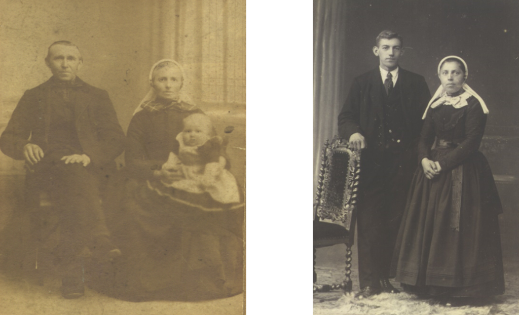 Links: Jan Stam (1861-1945) en Hermina Westerink met hun oudste spruit Thijs, IJsselmuiden, ca. 1889. Rechts: Johanna Stam (1896-1980) en haar timmerman Peter Felix, Grafhorst, ca. 1919.
