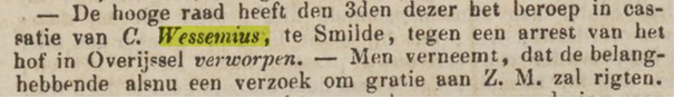 De huwelijken van de kinderen van Kornelis brachten ons evenmin veel vooruit. Op 25 januari 1824 trouwen in Smilde “Wijtze Gaukes thans de familienaam voerende van de Vries” en “Antien Kornelis thans de familienaam voerende van Wessemius”. Zij is de dochter van “Kornelis Dooysen thans de familienaam voerende van Wessemius schipper van beroep en van Femmigje Wouters”. Het zal wat wennen geweest zijn met die nieuwe namen zo kort na de invoering van de burgerlijke stand maar ze staan ferm onder de akte: bruid A.K. Wessemius en vader C.D. Wessemius.