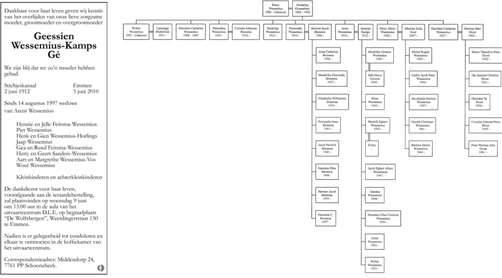 - Hillegonda Maria kreeg met Albert Joffers acht kinderen waarvan Jantje (1860 Smilde) in 1885 huwde met Egbert Mulder. Haar zus Heiltien (1862 Smilde) trouwde met molenaarszoon Jan Winters (1860-1935) en verhuisde naar Rotterdam. Weer schoot haar achterkleindochter Willy Peters-Keesmaat te hulp om ook deze tak tot leven te brengen. Met een knipoog herinnerde zij zich hoe haar moeder – zonder computer – altijd wist te benoemen dat haar voorouders Fries waren want ook de Winters waren voor de helft van Ludovicus Abrahami uit Grouw afkomstig. “Daarom kocht zij ook Friesche Vlag koffiemelk en Rivella.” Een beter ‘bewijs’ voor de juistheid van de Friese afstamming van het geslacht Wessemius dan juist deze orale geschiedenis is nauwelijks voorstelbaar.
