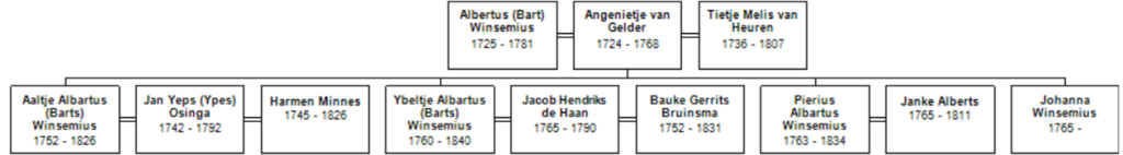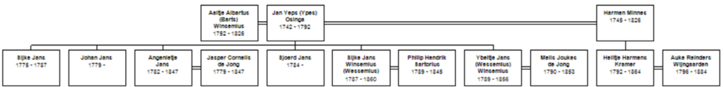 Tot zover lijkt alles eenvoudig maar dan ontstaat op het gebied van de naamgeving een totale verwarring die naar het inzicht van verre nazaat Albert Winsemius waarschijnlijk het best begrepen kan worden door een dusdanige desintegratie van de familie dat men namen en afstamming vergat. Het kostte een enorme studie om het volgende beeld op tafel te brengen. In 1782 wordt in St. Annaparochie een Sijke Jans gedoopt; de vader is Jan Sibes (moet zijn Jan Ypes), de moeder Neeltje Minnes (moet zijn Aaltje Alberts Winsemius). Sijke noemt zich, wanneer zij op 12 november 1809 in Leeuwarden trouwt met Philip Hendrik Sartorius, niet Sijke Jans maar Sijke Jans Winsemius, de naam van haar moeder, die deze naam echter weinig gebruikt en zich meestal Aaltje Barts of Bartles – voor Aaltje Albertus – noemt. Ook haar zusje Ybeltje voert de naam Winsemius wanneer zij op 20 mei 1815 in St. Anna Parochie trouwt met Melis Joukes de Jong, bakkersknecht van Warga. “Ybeltje Jans Winsemius, Dienstmaagd meede aldaar, meerderjarige dogter van Jan Ypes en Aaltje Barts (beide overleden) in leven Echtelieden te St. Jacobi Parochie, en aldaar geboren den 26 Maart 1790”, aldus de trouwakte. Vermoedelijk door de verplichte naamaanvaarding tijdens de Franse bezetting kwam men wat tot bezinning. De twee zusters hebben toen kennelijk de naam van hun moeder overgenomen, hetgeen overigens – zo blijkt uit de analyse van de burgerlijke stand – geenszins ongebruikelijk was.
