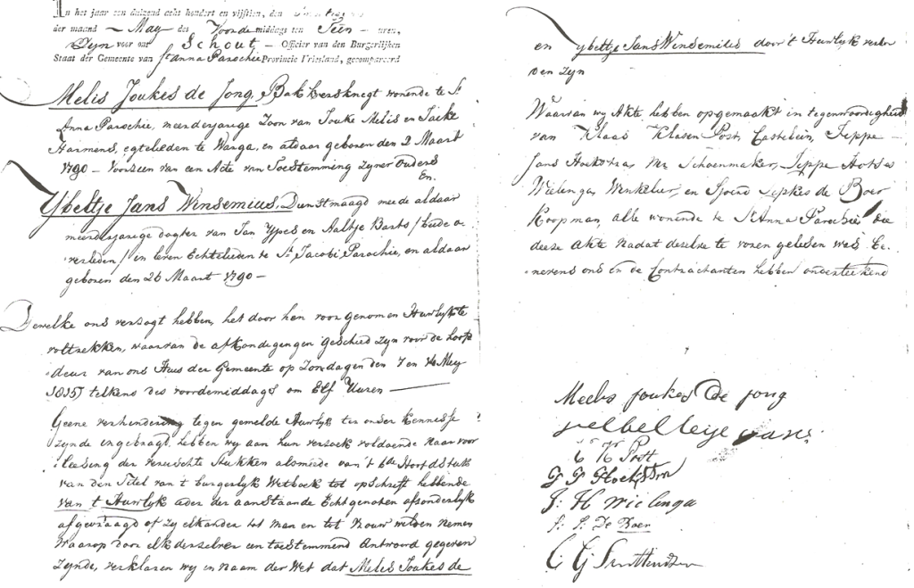 Huwelijk van Melis Joukes de Jong en Ybeltje Jans Winsemius op 20 mei 1815. Vermoedelijk heeft zij bij de verplichte invoering van achternamen in de Franse tijd, de naam van haar moeder aangenomen. Als moeder wordt vermeld Aaltje Barts. Het had moeten zijn Aaltje Albertus Winsemius.