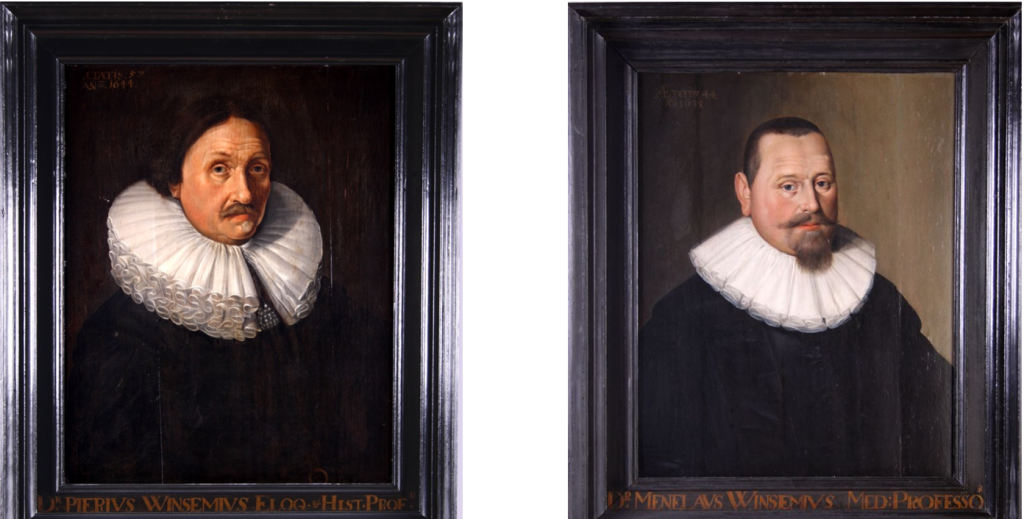 Portretten van Pierius en Menelaos Winsemius in het Koopmanshuis te Franeker. De schilders zijn onbekend. De afbeelding van Menealos stamt uit 1635; die van Pierius is postuum geschilderd en heeft als voorbeeld gediend voor de weer latere kopergravure en het schilderijtje op koper die van hem bekend zijn.