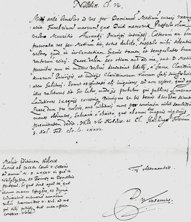 Ik stuur u het grafschrift, dat gij wilde, voor uw vader, een groot en, voeg ik eraan toe, voor het vaderland zeer verdienstelijk man, om te laten uithakken op de grafsteen. Het gedicht heb ik op uw aanraden uit drie disticha samengesteld, omdat de grafsteen niet meer kan bevatten. Toch heb ik nog een inscriptie toegevoegd, die, als de ruimte het toelaat, toegevoegd kan worden, door het gedenkteken te verheerlijken, waarbij we niets konden laten blijken van de zeer grote liefde en verering ten opzichte van de overledene. Moge gij dit dus aanvaarden, en vrijmoedig aangeven, als ge er iets in veranderd wilt hebben, opdat uw vaders ziel niets onbeleefds te verduren heeft. Vaarwel zeer geachte heer en groet uw familie beleefd namens mij.