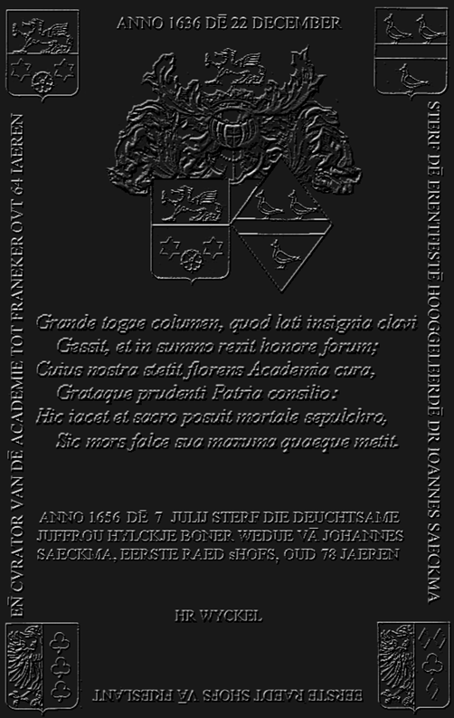 Voor God alleen en ter eeuwige gedachtenis van de zeer geachte en geleerde heer Johannes Saeckma, zeer waardig rechtsgeleerde en eerste raadsheer en curator van de universiteit, hebben de bedroefde echtgenote en kinderen dit gedenkteken voor haar lieve echtgenoot en hun lieve vader laten oprichten.
