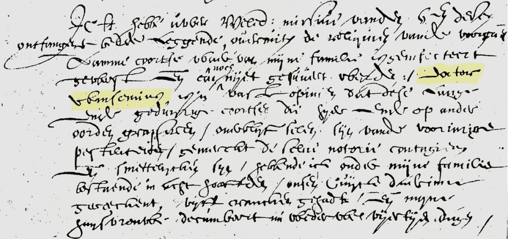 De hoogleraar Cornelis Pijnacker verwijst en marge van een advies aan de Drentse bestuurderen naar de medische kennis van zijn Franeker collega Doctor Winsemius; 9 mei 1638.
