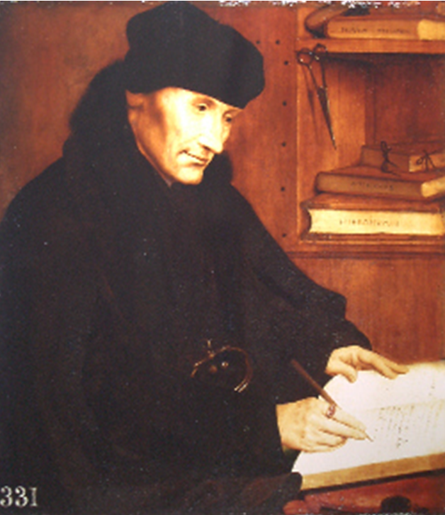 In 1517 heeft Erasmus zich voor het eerst laten portretteren. De toen vijftigjarige humanist is door Quinten Matsijs schrijvend afgebeeld. Op het schilderij zijn de boeken in de nis ten dele van een titel op snee voorzien. Waarschijnlijk heeft Erasmus de voor hem belangrijkste boeken uit zijn bibliotheek zorgvuldig gearrangeerd. Het zou dan gaan om de werken van de kerkvader Hieronymus, van de Griekse satiricus Lucianus (123), van de dito historicus Herodotus (311), het Nieuwe Testament (328, Erasmus’ Griekse en Latijnse editie van 1516) en Erasmus’ favoriete Latijnse auteur Horatius (88).