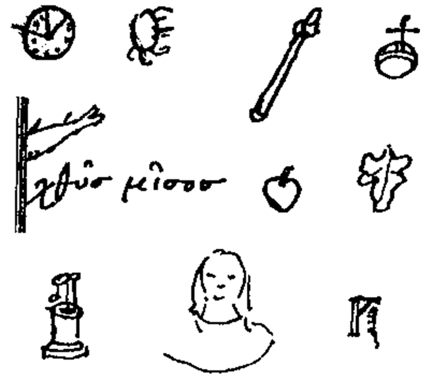 Tekeningen van Erasmus in zijn exemplaar van Plutarchus’ Moralia. Van links naar rechts en van boven naar beneden: zonnewijzer of klok waarop de vleier kijkt of het al etenstijd is, krab, scepter; wereld, vis (N.B. boekblok bijgesneden), hart, vijgenblad; put, kapmantel, hond aan een galg.