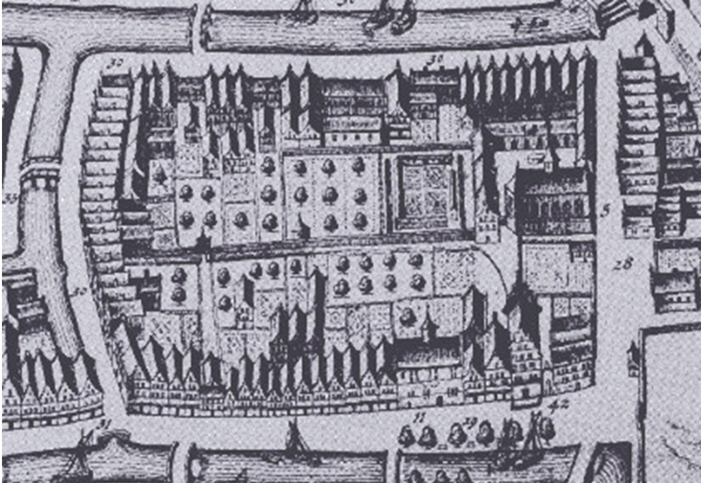 Plattegrond van Franeker door Johan Blaeu met daarop – iets rechts boven het midden – de hortus botanicus; 1643/44.